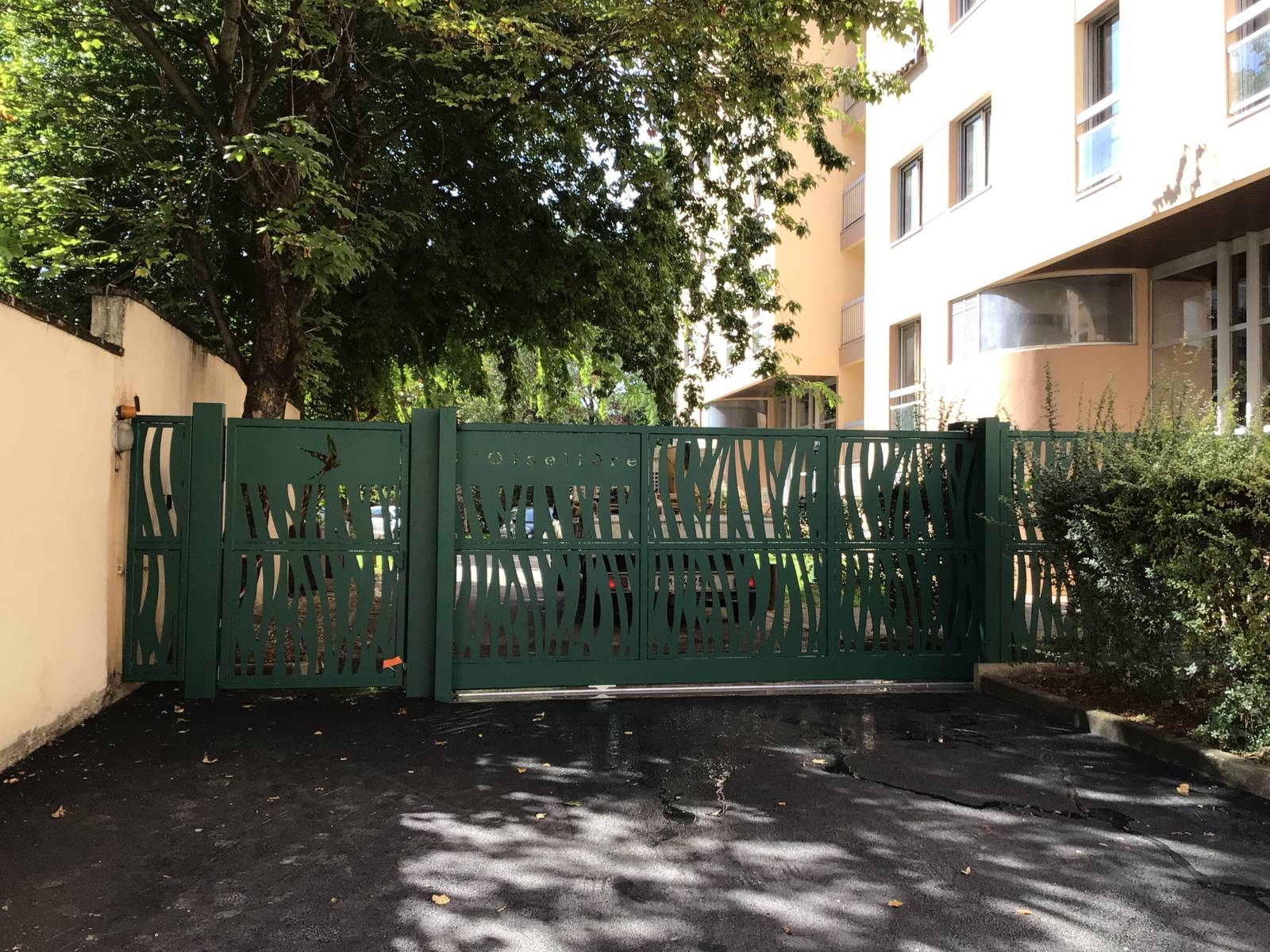 Portail coulissant, découpe laser motif végétal, avec portillon piéton – Installation sur mesure à Lyon